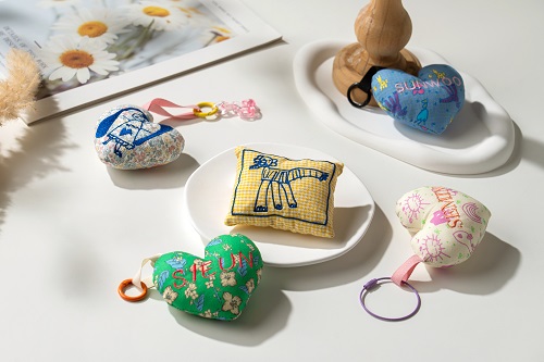 유니킷의 "패브릭 자수 키링"은 아이가 그린 그림을 컴퓨터로 작업한 후, 면 원단에 자수를 놓고 하트 모양으로 예쁘게 제봉하여 완성됩니다.